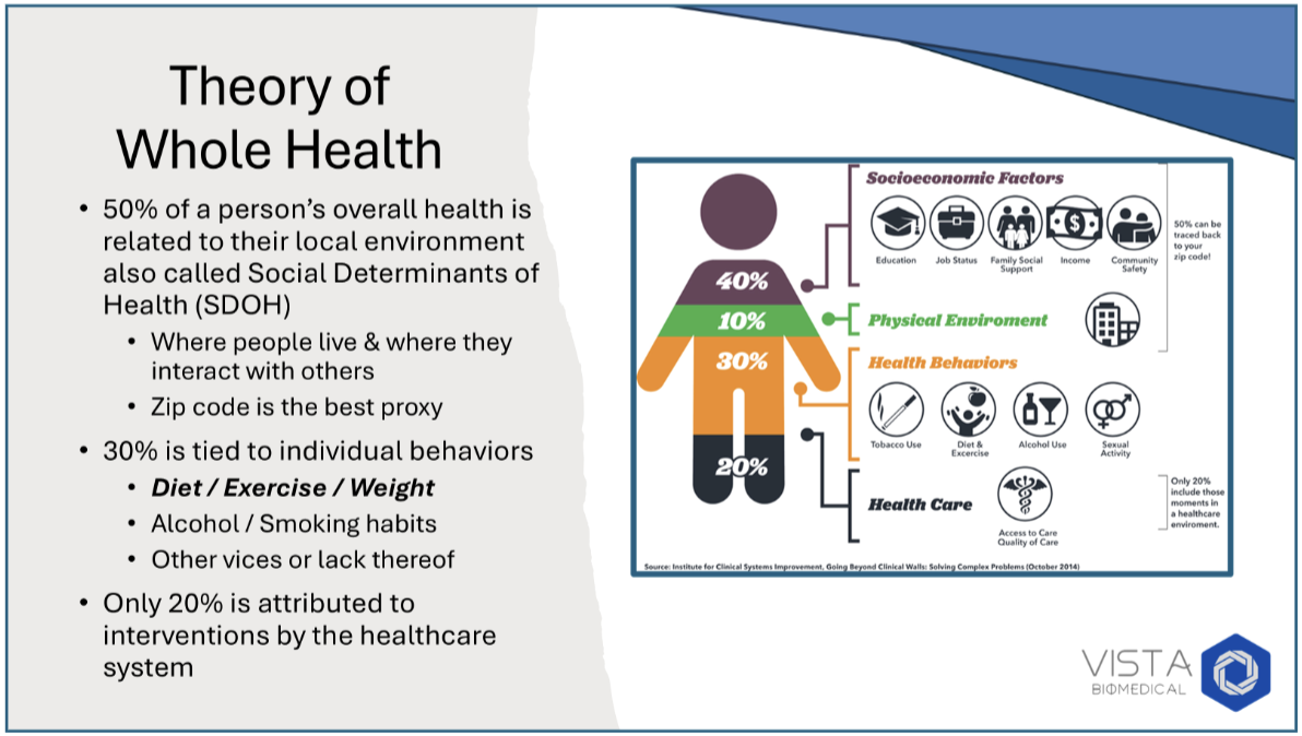 VBI has developed a state-of-the-art Social Determinates of Health (SDOH) software program that generates an overall health score for an individual based on the Theory of Whole Health detailed below. VBI has integrated this capability into its ActualHealth – Enterprise App and leverages it to provide a more complete picture of a person’s overall health, along with an individualized risk analysis for – diabetes, cardiovascular disease and depression. Further, the App places the individual health score in context with their neighbors’ overall scores and risk factors. This provides a unique, informative, and contextual assessment of an individual’s wellness.